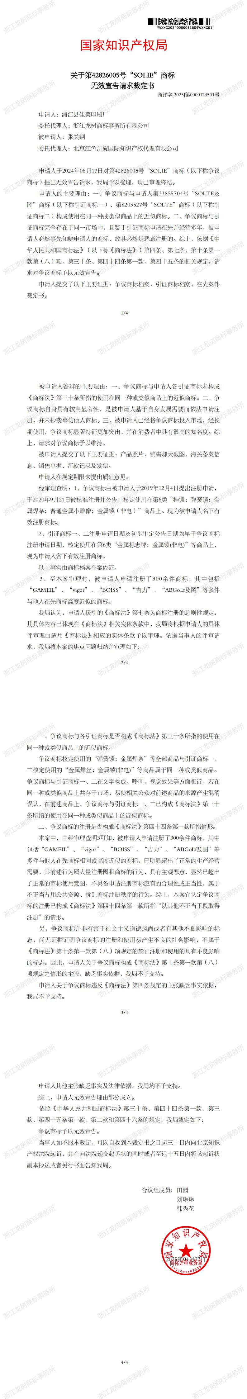 【龙树捷报】国家知识产权局判定第42826005号“SOI.IE”商标予以予以撤销,龙树代理浦江县佳美印刷厂获得胜诉